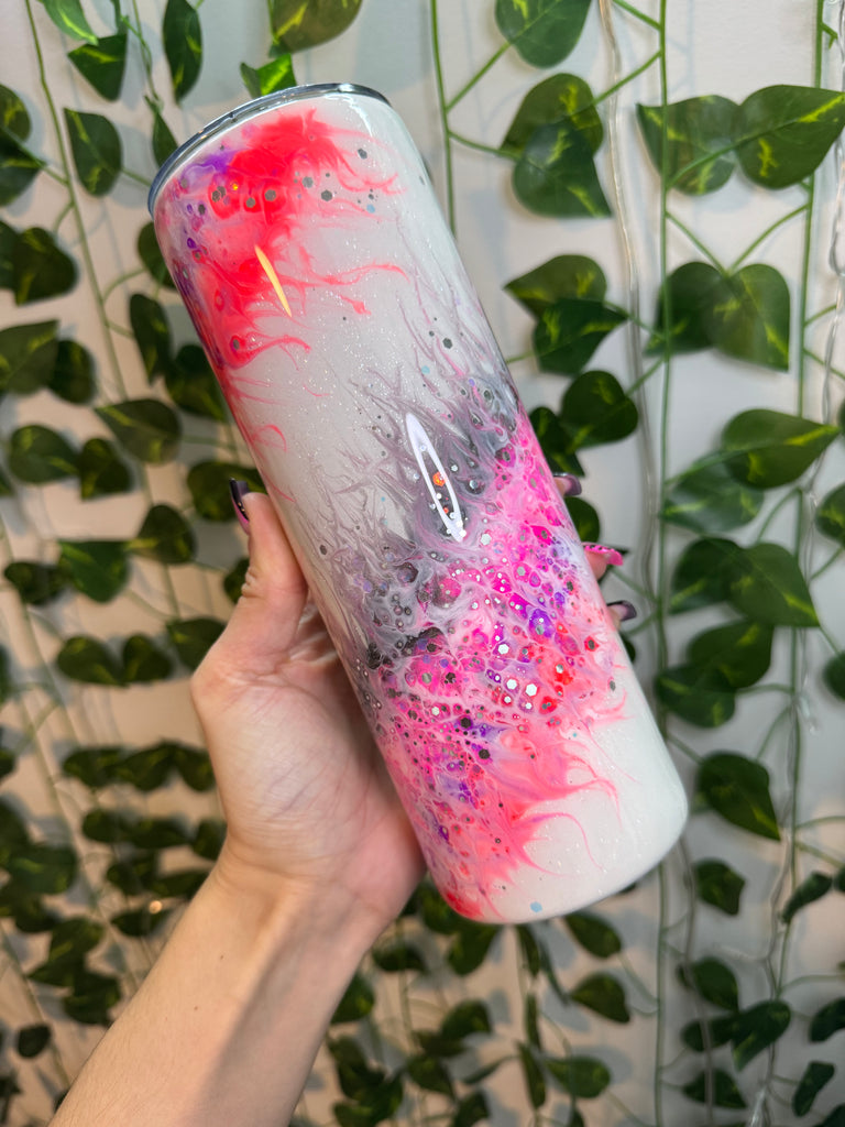 20oz Skinny with mica and glitter swirls! Purple, neon orange/coral, neon pink and some grey! With hints on glitter!